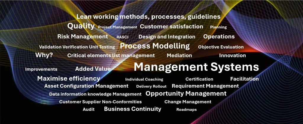 Rooted in the seven ISO Quality Principles and the Deming Cycle (Plan-Do-Check-Act), our interventions focus on enhancing the efficiency of your management system. We actively listen to process owners, line and senior managers, to understand their real concerns and how these actually impact the performance of their function within the company. Tailored to your needs and expectations, our independent and objective review and recommendations address all or selected working methods and processes: governance, vision, strategy, values, planning, and roadmaps; risk and opportunity management; critical elements list management; quality assurance and control; business continuity; human resources; project management across development, production, rollout, operations, maintenance, and end-of-life phases; requirements management; design and integration; validation, verification, and unit testing; customer, supplier, and internal non-conformities and deviations; innovation management; asset and configuration management; data, information, and knowledge management; and more.